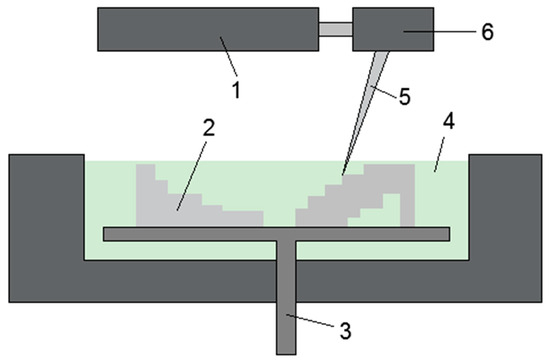 Working principle of the stereolithography apparatus: (1) laser; (2) cured resin layer; (3) lifting platform; (4) liquid resin; (5) laser beam; (6) scanning system.