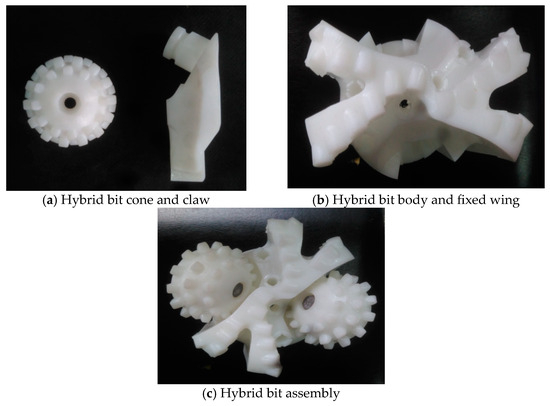 Individual PDC bits and roller cone bits are well developed already. Here, the processing of PDC–cone hybrid bit assemblies is mainly considered. Processing errors, assembly errors, and welding deformation of drill parts affect the accuracy of the drill diameter and the matching of the cone and fixed blades. Three-dimensional printing is applied to the manufacture of composite drill bits (as shown in Figure 5).