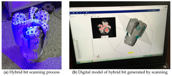 A PDC–cone hybrid bit (as shown in Figure 4) has two rock-breaking mechanisms, namely, continuous shear and cone crushing. The PDC bit cuts through rock continuously at the bottom of the well, where the PDC cutter penetrates into the formation under the effect of the bit pressure while it is still rotating. In this way, the PDC cutter breaks rock as it penetrates and cuts at the same time. Under the effect of the bit pressure, when the teeth in the same ring alternate with the adjacent teeth, the teeth strike the formation and form several rings of discontinuous concentric crushing pits at the bottom of the well. The crushing pits produced by the teeth can interrupt the continuous scraping action of PDC cutters, which causes overheating of the cutters, and thus mitigate thermal wear on the cutters and contribute to prolonging the lifespan of the cutters. They can also help the PDC bit to penetrate into the formation to achieve the shearing of the rock, which is a highly efficient rock-breaking mechanism in comparison with grinding [31,32].