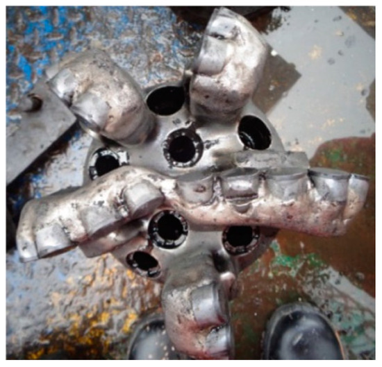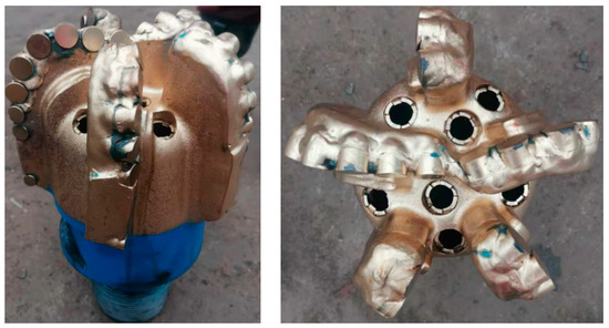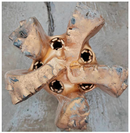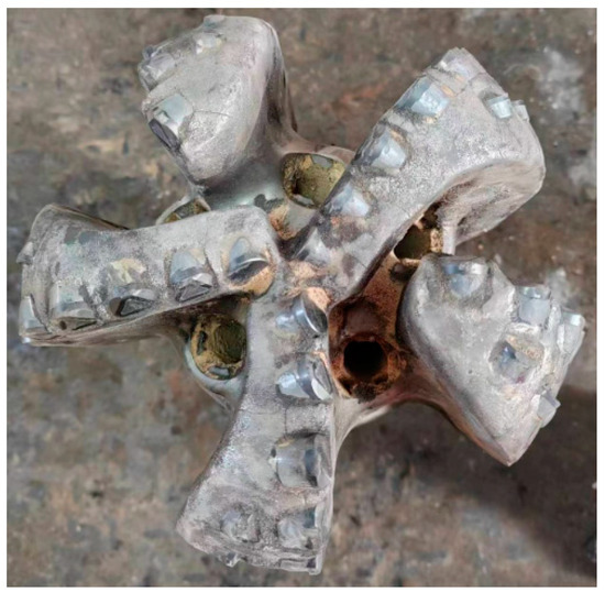The drill bit after being pulled out is shown in Figure 11. The wear condition of the drill bit was as follows: the inner cone cutting teeth of the drill bit were intact, the outer cone cutting teeth had 2–3 mm wear, and the diameter retaining teeth were not worn. The novelty of the drill bit reaches 80%, and it could be lowered into the well again.