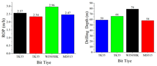 From the comparisons of the use of the PDC bit shown in Table 3 and Figure 9, it can be seen that the rate of penetration (ROP) of the new WS505HK PDC bit was at least 14.7% higher than those of bits in the same layer in offset wells. In comparison with the offset wells, the average ROP in the same formation increased by 25.8%. The drilling length was also greater than that of bits in the same layer in offset wells, with a minimum improvement of 3.8% over the same layer in an offset well and an average improvement of 7.7%. The new bit further improved the efficiency of rock breaking in comparison with conventional bits.