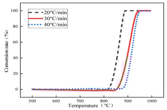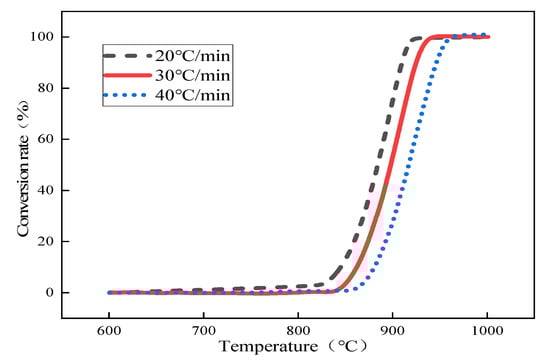 Based on the study of CO2 partial pressure on the thermal decomposition behavior of limestone in Section 2.3, in order to further calculate the kinetic parameters and kinetic model for the rapid thermal decomposition of small-particle limestone at the temperature of converter steelmaking, the atmospheric partial pressures of 0%, 25%, 50%, 75%, and 100% CO2 and heating rates of 20 °C/min, 30 °C/min, and 40 °C/min were used. The average limestone particle size was 0.44 mm. In this subsection, the improved double extrapolation method is used to calculate the conversion rate of limestone using the TG-DTG curve obtained from the thermal decomposition of limestone to solve the activation energy of limestone thermally decomposed under different partial pressures of carbon dioxide. Furthermore, the temperature increase rate is extrapolated to zero to obtain the activation energy of limestone in thermal equilibrium. The apparent activation energy of limestone in the initial state clarifies the most generalized mechanism model of the limestone decomposition reaction, taking 25% CO2 as an example. The following Figure 5 shows the curve of the thermal decomposition of limestone under different heating rates when the CO2 partial pressure is 25%.
