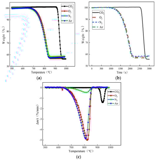 Effect of carrier gas atmosphere on limestone decomposition: (a) weight loss versus temperature curves under different atmospheres; (b) curves of weight loss with decomposition time under different atmospheres; and (c) DTG curves of limestone decomposition under different atmospheres.