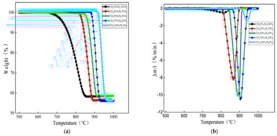 To further study the effect of small-particle limestone on the reaction limit and decomposition behavior under different CO2 partial pressures, based on the above study, experiments were carried out using an atmosphere of carbon dioxide and nitrogen mixed with standard gas and increasing the CO2 partial pressure for three groups of experiments of 25%, 50%, and 75%. The heating rate was still selected to be 10 °C/min, with an average limestone size of 0.44 mm. The pyrolysis characteristic curves of small-particle limestone in a total of five reaction atmospheres of 0% CO2, 25% CO2, 50% CO2, 75% CO2, and 100% CO2 are shown in Figure 4.