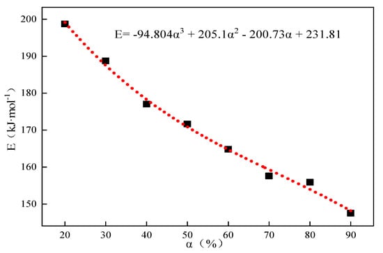 We fixed as the Y-axis and 1/T as the X-axis, and made a linear fit to a straight-line graph according to Y = AX + B. According to the slope of the fitted straight line, the apparent activation energy corresponding to a fixed conversion rate α was obtained. Using Equation (7), α was extrapolated to zero, and the value of Eα→0 was obtained, which was the value of Eα→0 without any interference of side reactions when the system was in the original state.
