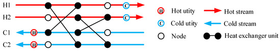 Figure 1 illustrates a schematic diagram of an example, labeled as H2C2. “H” and “C” signify hot and cold streams, respectively; the subsequent numerical values indicate the number of hot and cold streams. Specifically, H2C2 consists of NH = 2 hot streams and NC = 2 cold streams. In Figure 1, each horizontal line with arrows represents a stream, whereas the red and blue lines represent hot and cold streams. The arrows indicate the flow direction of the streams. Along each stream, hollow dots represent nodes where heat exchanger units can be located. At the end of the streams, a C in a blue hollow dot and an H in a red one indicate cold and hot utility, respectively. A set of solid nodes connected by a black straight line represents the presence of a heat exchanger unit at that specific location of a hot and cold node. In this example, the number of hot stream nodes per stream is set to NdH = 3, and the number of cold stream nodes per stream is set to NdC = 3. There are four heat exchanger units indicated by these solid nodes.