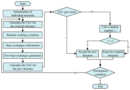 If the TAC of the evolved structure decreases compared to the previous iteration, it is accepted as the initial structure for the next iteration without any condition. However, if the TAC increases after evolution, the network with a higher cost is still considered with a certain probability, denoted as δ. To decide whether to accept the imperfect solution with increased cost, a randomly generated number denoted as r3 is compared to δ. If r3 is smaller than δ, the imperfect solution with the increased TAC is accepted as the initial structure for the next evolution iteration. Otherwise, the original structure from the previous iteration is retained. represents the TAC of the HEN for the iteration numbered it, and represents the TAC of the HEN for the (it + 1) iteration. The implementation method can be expressed as follows: