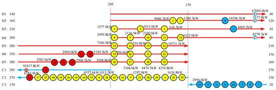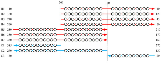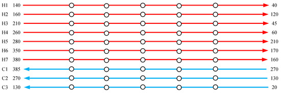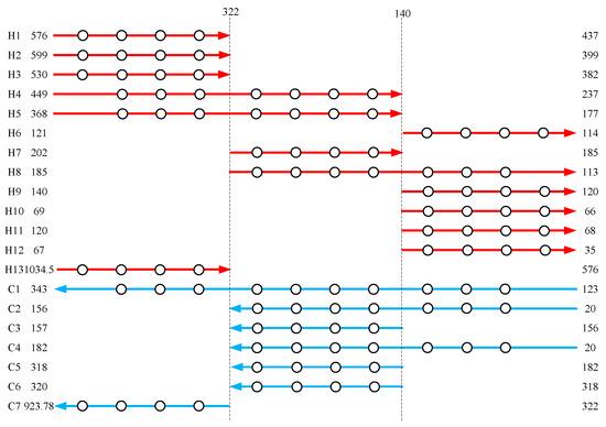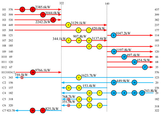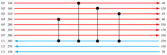 H7C3 case with infeasible matching. “H”/”C” means the symbols of hot/cold streams; red and blue arrows represent the hot and cold streams, respectively. The value at the initial and final points of the arrows indicate the streams’ supply/target temperatures. A Black line and a set of bullets mean a heat exchanger unit, and the same as following figures.