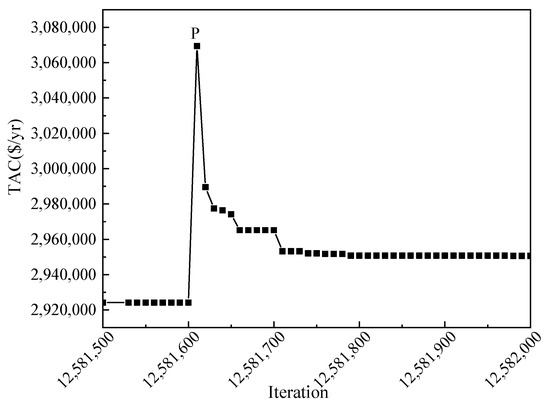 Accepting the infeasible solution at step 12,581,610 is a representative case illustrating its effect on the optimization path. In Figure 5, which demonstrates the change in cost during the optimization process of the nine-stream case, the point denoted as P represents the infeasible solution containing the penalty value accepted at step 12,581,610. As evident in Figure 5, the infeasible solution’s acceptance significantly impacts the TAC. Due to the penalty value associated with the infeasible solution, its TAC increases abruptly after being accepted. However, introducing this infeasible solution also obstructs the optimization process of the original feasible solutions. The subsequent optimization paths evolve with this infeasible solution as the starting point, influencing the direction of the optimization. Consequently, some feasible solutions with evolutionary potential lose the opportunity to continue their evolution and may miss out on discovering better solutions. This effect leads to a decline in the optimization path and a stagnation in TAC, negatively impacting the overall optimization process.