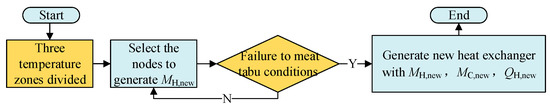 The primary process of the method is the same as that of the RWCE, except for a change in the operation of the new heat exchanger unit generation. A random empty node on the hot and cold streams is selected during the new individual generation stage to form a heat transfer match. If the temperature position meets the tabu-matching conditions, the location of the newly generated heat transfer unit is revisited to re-select the hot and cold streams. If not, the heat transfer match is randomly assigned a specific heat load, and a new heat transfer unit is generated, continuing the optimization downward. The stage of new heat exchanger generation of the RWCE is improved, as shown in Figure 7. The yellow parts are improvement to RWCE, while the blue one is the original parts of RWCE.