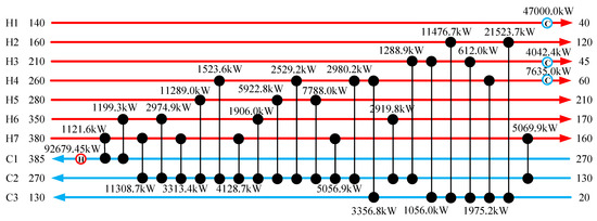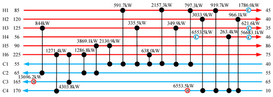 The hot stream exchanges heat with the inner cold utility. In contrast, the cold stream exchanges heat with the inner hot utility. In this case, the temperature can be obtained from Equations (29) and (30). If the constraint of the inner utilities is not met, as shown in Equations (31)–(34), the nodes are reselected.