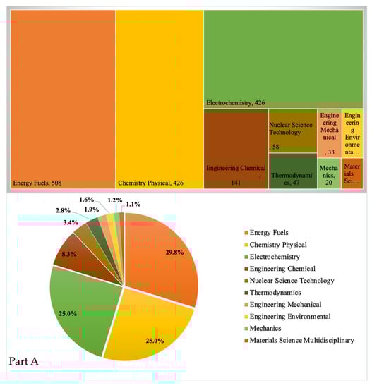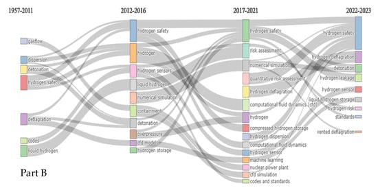 As depicted in Figure 1, Part A, the subject of “Hydrogen Safety” has garnered significant attention across diverse application domains. Notably, it has been extensively explored and researched in the fields of energy fuels (29%, 508 records), physical chemistry (25%, 426 records), electrochemistry (25%, 4256 records), chemical engineering (8.8%, 141 records), nuclear science technology (3.4%, 58 records), and others. These statistics highlight the widespread interest and ongoing advancements in enhancing hydrogen safety. A concise bibliometric and meta-data analysis was conducted using the Biblioshiny software package (https://www.bibliometrix.org, accessed on 3 August 2023), implemented in the R programming language [20]. This powerful tool enabled the examination of relevant bibliographic data, providing valuable insights and facilitating a comprehensive understanding of the subject matter. Bibliometric analyses yield invaluable insights for scientists and practitioners investigating a particular field. Examining publication patterns and citation metrics provides a deeper understanding of academic gaps, identifies areas for improvement in the existing literature, and highlights emerging trends or hotspots within a field.