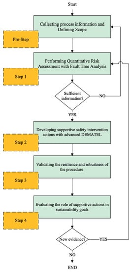 This section aims to enhance and elaborate on the proposed framework for assessing and evaluating the sustainable operations management of HV safety from a CE perspective. By integrating CE principles into the evaluation process, a more comprehensive and environmentally conscious approach can be used for the operation of HV safety. Figure 3 provides an overview of the key four-step framework. This developed framework provides practical decision-makers and policymakers with valuable insights to operate HVs safely and achieve their sustainability objectives effectively. In the pre-step, the study’s system and scope are defined and all necessary process information is gathered. Step one involves implementing a risk assessment technique, specifically using fault tree analysis, to identify the root causes of the worst-case HV scenarios. If sufficient information is available at this stage, then the process can proceed. However, if additional data are required, it is necessary to return to the pre-step and complete further data collection. Step two focuses on establishing the causal relationships between the critical root causes identified in step one and formulating corresponding safety intervention actions. These actions are designed to support and address the identified root causes effectively. In step three, a validation process is conducted to demonstrate the robustness and resilience of the proposed approach. This validation serves to ensure the reliability and effectiveness of the framework. Step four entails a subjective examination of the role played by the supportive actions in achieving sustainability goals. This step explores how qualitatively the identified interventions contribute to the overall sustainability objectives. Finally, if new information becomes available during the evaluation process, then it is necessary to return to step one to reassess and update the risk assessment and intervention actions accordingly.