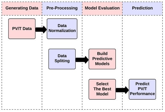 The software that was used to train, validate, and test the models was the R statistical computing environment (version 4.1.1), deploying Keras and TensorFlow libraries [35,36]. Similarly, all data were normalized using the min–max method to accelerate the computation time during the training session. The dataset applied by models was divided into training (80%), validation (10%), and testing (10%) to avoid overfitting during the training phase. Figure 3 shows a block diagram that clarifies all the processes necessary to predict the performance of the thermal/photovoltaic collector cooled by nanofluid. All pre-processing techniques were explained in detail in previous works [37,38].