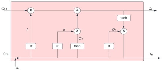 The forget gate, input gate, and output gate are the gates that make up the LSTM’s architecture. The forget gate determines which data are left out of the cell state. The input gate then determines the data that are saved and included in the cell state. The output gate then selects the output data and sends them to the following node [40]. Figure 4 shows the LSTM model structure. Equations for all gates are: