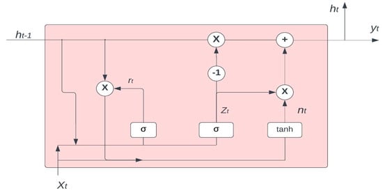 Kyunghyun Cho developed a gated recurrent unit (GRU) in 2014 [41]. Long short-term unit (LSTM) and gated recurrent unit (GRU) both have the capacity to handle the gradient vanishing problem. Similar to LSTM, GRU can exclude irrelevant prior observations in the context of the current data and take into account only prior observations that have an impact on the response. In contrast to LSTM, which uses a separate memory cell to address the gradient vanishing problem, GRU has an update gate z and a reset gate r. This is how the two models differ. Figure 5 shows the GRU model structure. The following equations refer to activation , candidate activation , update gate , and reset gate .