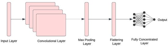 Figure 6 shows the structure of a CNN. It consists of a convolutional layer, a pooling layer, a flattening layer, and a fully connected layer. The main layer in this network is the convolutional layer, which reduces computational complexity through sliding windows and weight sharing. The layer after that is the pooling layer. It lowers the size of the feature map and runs each of them independently, which allows for the identification of the dominant features in the training phase. The pooling layer used in this work is known as the max pooling layer. The last two layers are the flattening layer and the fully connected layer, respectively. It is important to note that the flattering layer turns data into a one-dimensional vector to allow the fully connected layer to connect neurons between other layers [42].