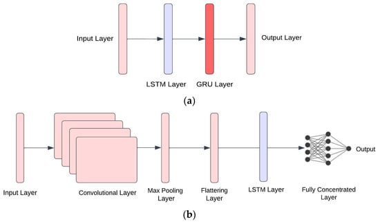 The three previous models mentioned above can be developed into hybrid structures. Figure 7a shows the developed structure for the LSTM-GRU network. Figure 7b demonstrates the integrated CNN-LSTM structure. Table 2 summarizes all the structure layers for all the developed models.