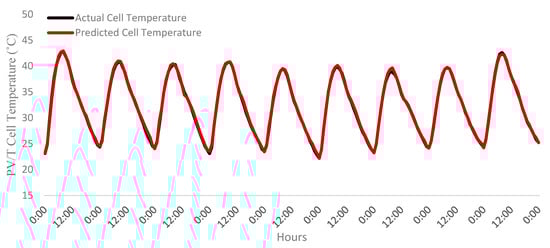 A time series plot for the actual PV/T cell temperature versus the predicted PV/T cell temperature for 9 days in the dataset.