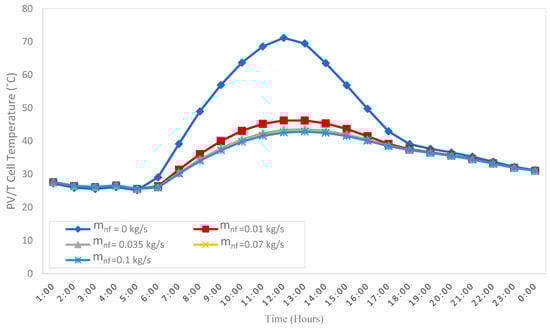 A comparison between the cell temperature prediction for a PV/T system for a non-cooling case with various cooling flowrates using nanofluid.