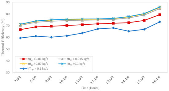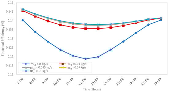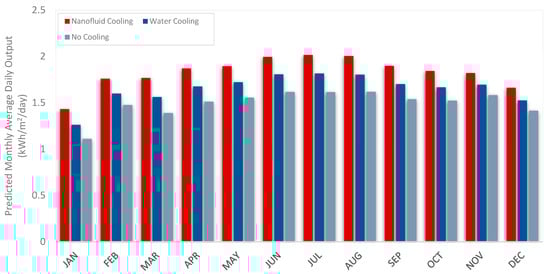 The applied dataset was also utilized to predict the electrical and thermal performance of the PV/T system cooled by nanofluid. Figure 10 demonstrates a comparison of the predicted electrical performance of the PV/T for the non-cooling case versus various nanofluid flowrates in the daytime on the first day of July. It can be observed that the predicted electrical performance of the non-cooling case could be significantly increased by nanofluid cooling from approximately 11.8% to 14% under the effect of high temperature. Figure 11 shows a comparison of the predicted thermal performance of the same system cooled by nanofluid against water cooling. The average predicted thermal performance of the proposed system cooled by nanofluid jumped from roughly 65% to 75% in comparison with water cooling. Figure 12 demonstrates a comparison of the predicted monthly daily production for a PV system versus a water cooling and nanofluid cooling PV/T system. For the PV system, the predicted average daily electrical energy output varied from roughly 1.1 to 1.5 kWh/m2/day all year round. For PV/T cooling by nanofluid, however, the predicted average daily electrical energy production could be increased to approximately 1.5–2 kWh/m2/day through the whole year.