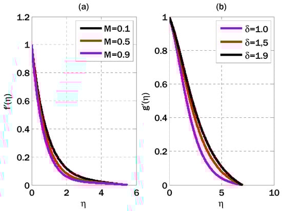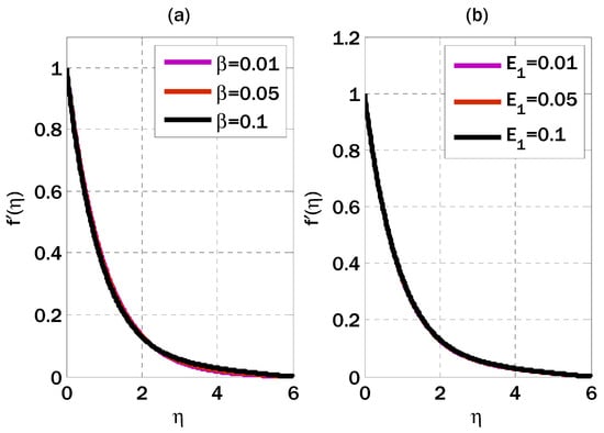Due to magnetic field intensities and fluid conditions, the Hall effect may not be justified in our investigation of induced magnetic fields in electrical boundary layer flows. The main focus is on understanding the interaction between the induced magnetic field and the fluid flow without considering ancillary effects that may not be relevant. The studies mentioned [,,] examine instances where ion slip and Hall effects play a significant role under specific circumstances. In contrast, our study concentrates on the electrical boundary layer flow with generated magnetic fields, enabling us to simplify the model by excluding these effects. The decision to disregard these effects is supported by the comparatively moderate flow velocities, magnetic field strengths, and ion densities in the situations under consideration.