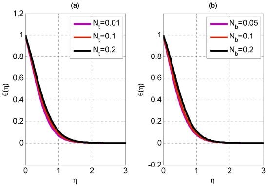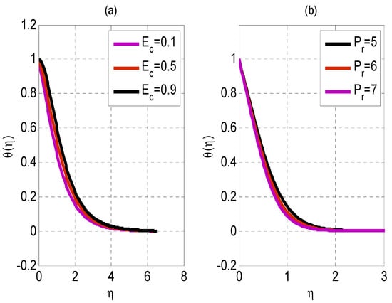 The effect of magnetic and local electric factors on the velocity profile is depicted in Figure 2. By increasing local electric parameters and magnetic factors, velocity exhibits a dual characteristic. The impact of and on and are depicted in Figure 3. The velocity profile decays by rising while rises by enhancing . As the Lorentz force opposing the velocity profile increases, the velocity profile degrades. The impact of Eckert and Prandtl numbers on temperature profile θ is displayed in Figure 4. Eckert and Prandtl numbers are increased and decreased to create the temperature profile. Internal friction between fluid particles causes the temperature profile to climb as the Eckert number increases. Lower thermal conductivity due to declining thermal diffusivity as the Prandtl number rises is what causes the temperature profile to degrade. Temperature profiles as a function of thermophoresis and Brownian motion parameters are shown in Figure 5. By increasing thermophoresis and Brownian motion parameters, the temperature profile rises. The improvement in the thermophoresis force causes the temperature profile to rise due to increasing thermophoresis parameters. Cold particles travel toward the plate as a result of the force of thermophoresis, which draws hot fluid particles to their vicinity.