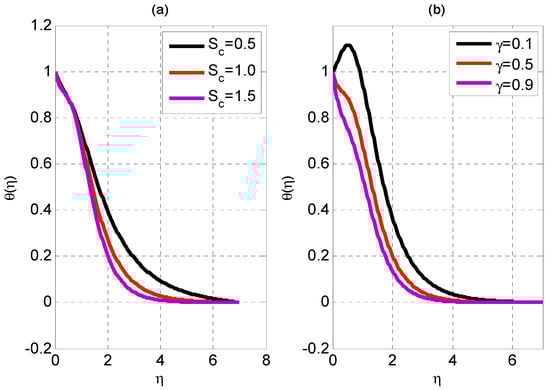 Additionally, the hotter particles are randomized in a different direction due to the development in the Brownian motion parameter spreads. The temperature profile rises as a result. Concentration profiles for varying Schmidt numbers and reaction rate parameters are shown in Figure 6. The quality of the concentration profile decreases as the Schmidt number rises. As the Schmidt number increases, the concentration profile increases due to the loss in mass diffusivity.
