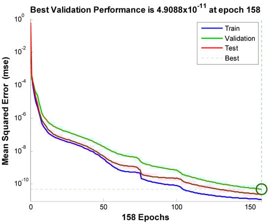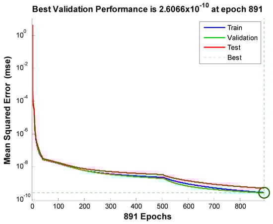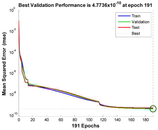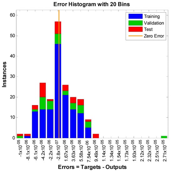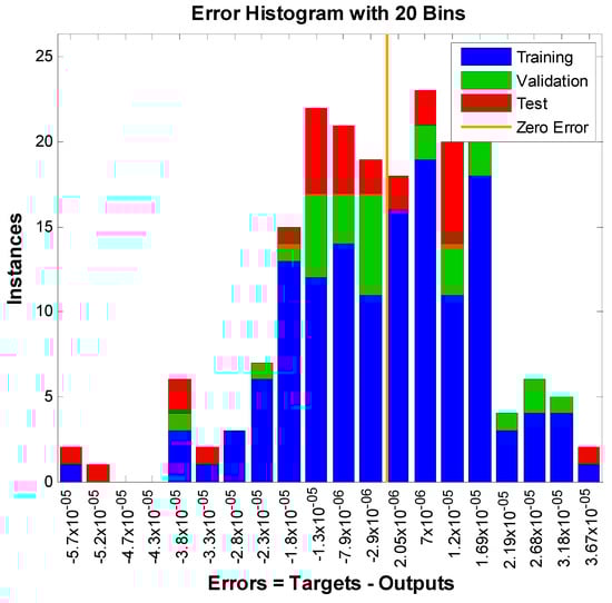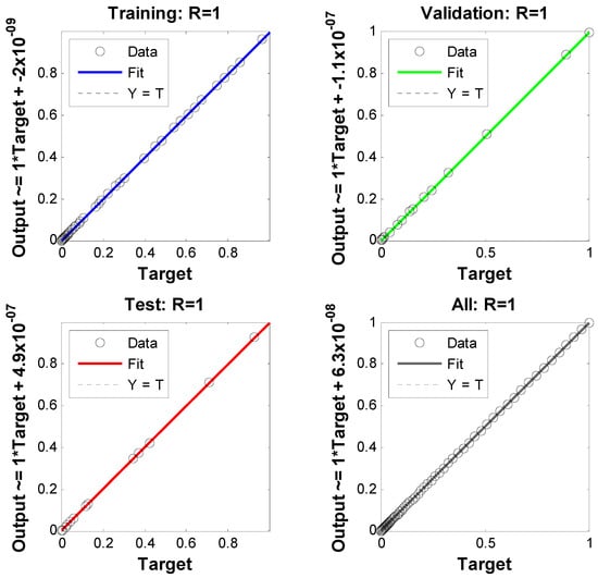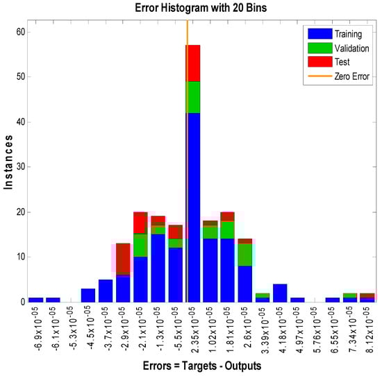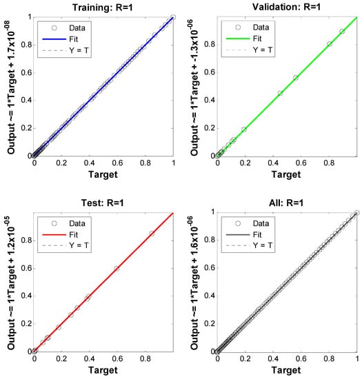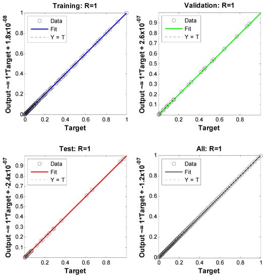 The study of artificial neural networks for the inputs and outputs of the model under consideration is also presented here. Three inputs represent the velocity, temperature, and concentration profiles. For these simulations, a two-layer feed-forward network is considered. For enough memory, the Levenberg–Marquardt backpropagation algorithm trains the network; otherwise, scaled conjugate gradient backpropagation is utilized by nftool. A total of 70% of samples were used for training, 15% for validation, and 15% for testing. In addition, 10 was the number of hidden neurons that were considered. For the simulation of input and output of velocity, 891 iterations were consumed. One hundred fifty-eight iterations for the network training corresponding to the temperature profile were consumed. The algorithm consumed one hundred ninety-one iterations corresponding to the concentration profile. The most successful velocity, temperature, and concentration profile validation results are displayed in Figure 7, Figure 8 and Figure 9, respectively. The error histograms for the training, validation, and test datasets are displayed in Figure 10, Figure 11 and Figure 12. These error histograms also show zero error. The zero error is the minimum error achieved by the set of samples for training, validation, and testing. Figure 13, Figure 14 and Figure 15 show the regression analysis. Figure 13, Figure 14 and Figure 15 show how closely the output is related to the target.