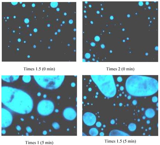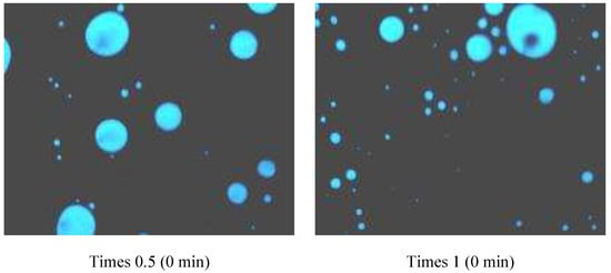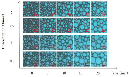 It can be seen from Figure 12 that at 0 min, the sizes of the lotions formed by mixing different concentrations of integrated agent and crude oil in a ratio of 1:1 were different. As the concentration of the integrated agent increased, the diameter of the emulsion became smaller, and the more small emulsions there were, the better the emulsifying ability and stability. In the figure, it can be seen that, as time went on, after emulsification with 1 and 1.5 times the emulsion, the emulsion continued to coalesce and its stability gradually deteriorated, providing the conditions for the demulsification of the emulsion. As the emulsion is an oil-in-water type, the integrated agent adsorbs at the oil–water interface, preventing the dispersed water droplets in the oil phase from coalescing in one place. The oil-in-water type emulsion is more likely to improve the performance of the anti-aggregation agent.