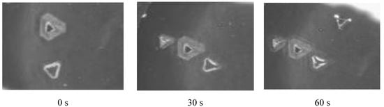 Due to the difficulty in forming hydrates in normal environments, the formation of tetrahydrofuran hydrates using self-built instruments was studied and discussed. Figure 5 shows the growth morphology of the hydrates as time increased at 2 °C. It can be seen that from 0 s onwards, hydrates continued to form at the edge of the liquid surface and attracted each other towards the middle of the droplets. This is because there is a cohesive force between the formed hydrate and the forming hydrate, which forces them to attract and aggregate with each other. Moreover, there is a certain repulsive effect at the interface between the formed hydrate and the formed hydrate, causing the formed hydrate to continuously aggregate towards the middle.