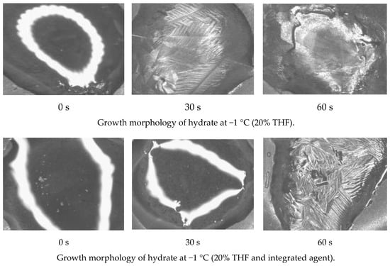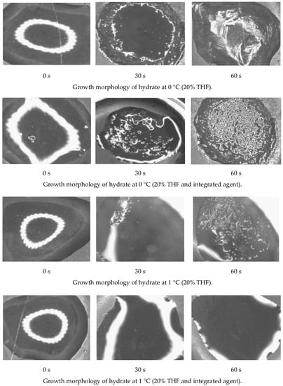 As shown in Figure 6, At −1 °C, the structure of the THF hydrate was more loose and the hydrate formation rate slowed down compared to the THF hydrate added as a whole agent. At 30 s, the 20% THF hydrate was basically completely formed and mostly generated giant crystals, while the hydrate containing an organic agent was only generated on a large scale at 60 s. At 0 °C for 60 s, the hydrate crystal structure formed by 20% THF was significantly more compact. At 1 °C, the risk of hydrate formation was significantly reduced after the addition of an integrated agent, which grew slowly and was looser compared to the hydrates formed without an integrated agent. It did not aggregate into large-scale crystals due to the arrangement and adsorption of integrated agent molecules on the surface of the hydrates. The charge of hydrophilic groups in the integrated agent can repel each other, thereby preventing the aggregation of hydrates []. In summary, the integrated agent has an inhibitory effect on the formation of THF hydrates and has a good anti-aggregation effect.