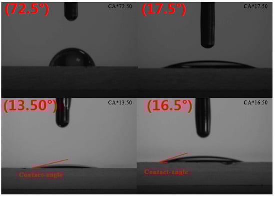 From Table 1 and Table 2, it can be seen that the interfacial tension value gradually decreased with the increase in the concentration of the integrated agent, and the tension changed more rapidly in the low-concentration range. This is mainly because the surface molecules of the solution are oriented and continuously form a single molecular layer of the integrated agent. The hydrophobic end arrangement increased, and the surface tension decreased until the critical micelle concentration was reached. At this point, the surface tension appeared to have a turning point, and the surface tension value was 23.5 mN/m, Due to the lack of interfacial activity in the micelles inside the solution, the interfacial tension tends to stabilize. As the concentration increased, there was a slight increase in surface tension, which may be due to the diversification of the integrated agent and the formation of complex micelles, thereby affecting the molecular concentration on the surface and causing changes in surface and interfacial tension [,]. The same applies to the variation of interfacial tension, with a minimum value of 2.3 × 10−2 mN/m.