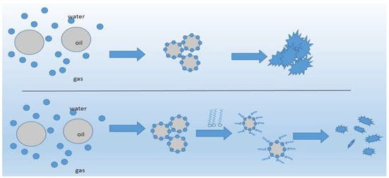 As shown in Figure 7, compared to the cleaned-glass surface after treatment, the glass surface soaked with the integrated agent was significantly more hydrophilic and oil friendly. Through measurement, it was found that the integrated agent had better hydrophilicity, which is consistent with the anti-aggregation mechanism. On the one hand, the hydrophilic groups of the integrated agent were adsorbed on the surface of the hydrate, while the surfaces of adjacent hydrates were prevented from approaching each other due to the hydrophobic and hydrophilic groups’ charge properties; On the other hand, the addition of an all-in-one agent disrupted the activity of the water molecules by hydrophilic groups, resulting in a decrease in the amount of hydrate formation. The anti-aggregation mechanism of the hydrates is shown in Figure 8.