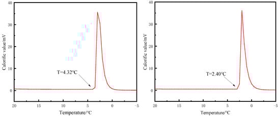As shown in Figure 9, with the operation of the cooling program, the solution gradually transformed from liquid to solid, and the formation of hydrates released heat, resulting in a change in calorific value. As a result, an upward heat release peak appeared in the image. At this time, the initial point of heat change was the phase transition point of the hydrates. As shown on the left of Figure 9, the phase transition point of 20% THF hydrate was 4.32 °C, indicating that THF hydrate begins to grow at this temperature. The right side of Figure 9 shows the phase transition point of the hydrate after the addition of an integrated agent. Compared with the 20% THF hydrate, the phase transition point decreased by 1.92 °C, significantly reducing the risk of hydrate formation. This is because the molecules of the integrated agent not only hinder the hydrogen bonding of water molecules to form a cage-like structure of hydrates, but also interfere with the activity of the water molecules, effectively reducing the aggregation of water and matter.