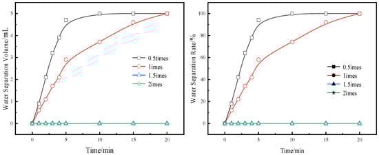 Samples of 10 mL of different concentration multiples (times 0.5, 1, 1.5, 2) were taken of the integrated agent and condensate oil in a 1:1 ratio and placed in a centrifuge tube. They were placed in a 45 °C water bath at a constant temperature for 10 min and then taken out. They were shaken in the left and right hands 50 times each to form an emulsion, then placed in a water bath and the time and amount of water released was recorded. The precipitation rate was calculated: