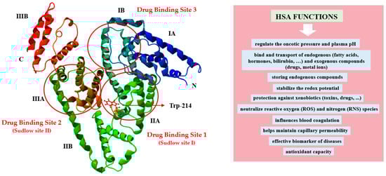 Location of HSA drug-binding sites and the Trp-214 residue, along with the main functions of albumin in the body, adapted from Refs. [,].
