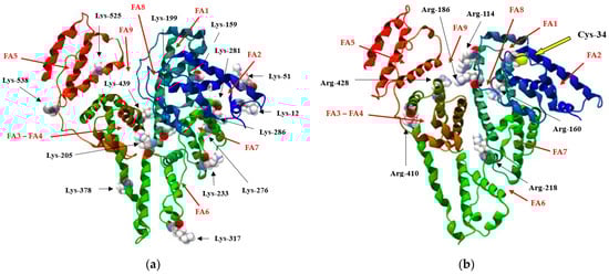 The 3D model of HSA, illustrating the primary fatty-acid-binding sites (FA1–FA9), with specific emphasis on (a) lysine (Lys) residues and (b) arginine (Arg) residues, both of which are implicated in the in vivo glycation process.