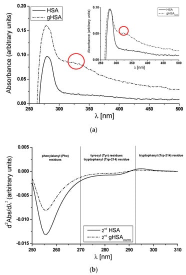 Ultraviolet spectra of non-(HSA) and glycated (gHSA) defatted albumin ([HSA] = [gHSA] 5 × 10−6 mol·L−1) with glucose–fructose syrup (GFS) (Figure 3a, main view), along with the absorption spectrum of gHSA (gHSAnorm) normalized to the maximum absorbance of the HSA (Figure 3a, insert). Figure 3b presents the second derivative of the absorption spectrum of HSA and gHSAnorm. These observations are used to demonstrate that structural changes in albumin occur under the influence of glycation.