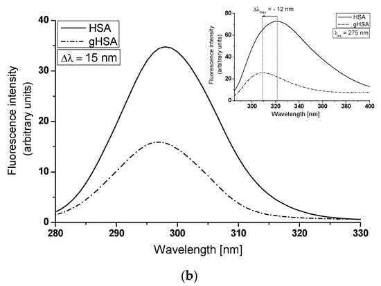 To illustrate the conformational changes in the environment of the Trp-214 and Tyr residues of HSA due to glycation, synchronous and emission spectra of HSA and gHSA have been analyzed (Figure 4a,b). It is worth noting that the wavelength of 295 nm primarily excites Trp-214, while at 275 nm, both Tyr and Trp-214 residues are excited. Furthermore, it should be emphasized that it is not possible to separately observe the fluorescence of these fluorophores. Synchronous fluorescence spectroscopy serves as an informative source about the structure of the macromolecules as it enables the separation of emission spectra that originate from Trp-214 and Tyr residues, as demonstrated in the main view of Figure 4a,b. The wavelength intervals, which relate to the minimal overlap of fluorescence from Trp-214 and Tyr residues in the synchronous band, are specified as Δλ = 60 nm and Δλ = 15 nm, respectively.