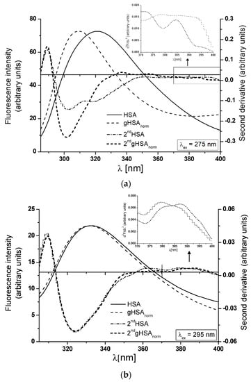 In the main view: glycated albumin emission spectra gHSA normalized to non-glycated HSA (gHSAnorm), together with the second derivative fluorescence spectra of HSA and gHSAnorm (2nd HSA, 2nd gHSAnorm) for (a) λex = 275 nm and (b) λex = 295 nm. In the insert: detail of the Trp-214 region, covering the 370–400 nm wavelength range.