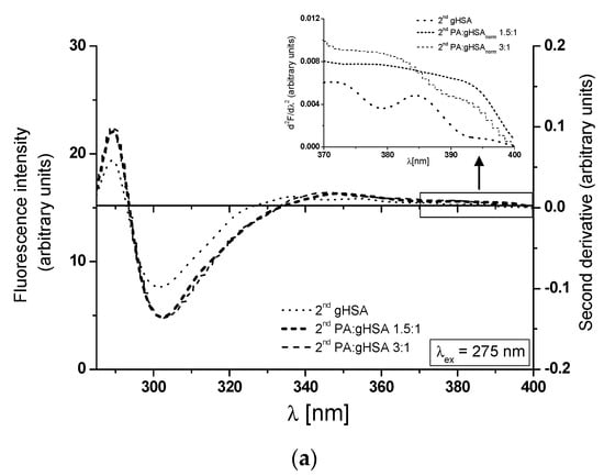 At λex = 275 nm, the 2nd gHSA, the 2nd PA:gHSAnorm 1.5:1, and the 2nd PA:gHSAnorm 3:1 show only one peak maximum at a wavelength of 301 nm (Figure 7a, main view). For λex = 295 nm, the 2nd gHSA and the 2nd PA:gHSAnorm 3:1 display two peak maxima (at wavelengths of 323 nm and ~340 nm), while the 2nd PA:gHSAnorm 1.5:1 exhibits only one peak maximum at a wavelength of 323 nm (Figure 7b, main view). As illustrated in Figure 7, significant changes in the shape of the second derivative spectra of macromolecules can be observed in the wavelength range of 370–400 nm (Figure 7a,b, in the insert). These observations may suggest the influence of palmitic acid on the glycation process of HSA, particularly in the environment of the Trp-214 residue. The values of the second derivative spectra for gHSA, PA:gHSAnorm 1.5:1, and PA:gHSAnorm 3:1 have been determined using the peak-to-peak method as an empirical parameter H []. The values of parameter H for the study proteins are collected in Table 4.