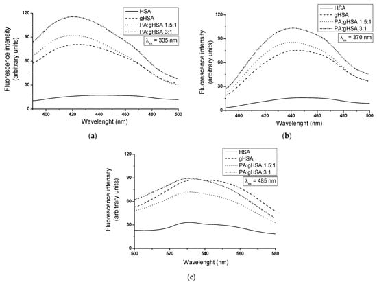Emission fluorescence spectra of AGEs in non-glycated (HSA), glycated (gHSA), and glycated in the presence of palmitic acid (PA) albumin (with molar ratios of PA:gHSA 1.5:1 and PA:gHSA 3:1) at excitation wavelengths of (a) λex = 335 nm, (b) λex = 370 nm, and (c) λex = 485 nm. Albumin concentration was 5 × 10−6 mol·L−1; t = 37 °C.