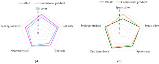 Healthy volunteers were asked to fill in a questionnaire after using the oral care products two times. The satisfaction level was determined using a 5-point scale, in which the point value represented the volunteers’ feelings about how well the product worked, from very satisfied (5) to very dissatisfied (1). The results revealed that the volunteers were satisfied with the oral ulcer gel, with the responses mostly being between uncertain and very satisfied for all the areas measured, as shown in Figure 2A. The most satisfying properties of the oral ulcer gel OG-9 were the color and the odor of the gel, which had means of 4.38 and 4.16, respectively, whereas the lowest score of the oral ulcer gel was the taste, with a mean of 3.55. Moreover, the results of the oral spray were also satisfying, with most responses being between uncertain and very satisfying for all the areas measured, as shown in Figure 2B. The most satisfying properties of the oral spray MS-10 were that it is an oral demulcent and the satisfactory effect of the spray, which had an equal mean of 4.25, while the lowest score of the spray was given for the color, with a mean of 3.18. Additionally, none of the healthy volunteers experienced oral or mouth irritation and had no allergic reactions during the test period.