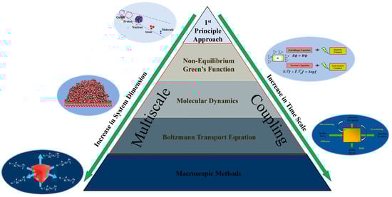 According to Moore’s Law, the number of transistors that fit into an integrated circuit doubles every second year, indicating the aggressive miniaturization goals of electronic devices over time. These goals are achieved by the improved production of characterized materials with varied length scales. Polymer-nanocomposites [1], multilayer-coating [2], optoelectronic devices [2], microelectronic devices [3], and semiconductor quantum dots [4], are some applications of these characterized materials. However, the major trade-offs while designing these sophisticated and miniaturized devices are the thermal management and energy conversion issues. The control of thermal management requires a complete understanding of the transfer of heat [5] from a system. In micro or nanoscales, the surface-to-volume ratio becomes very high, which makes the classical laws of the heat transfer phenomenon distinctly different [5,6].