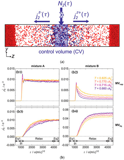 Mass and heat transfer processes are highly important for fluid separation processes, absorption, distillation, and various chemical engineering unit operations. A recent study by Schaefer et al. [60] performed a dual control volume (DVC) based non-equilibrium MD simulation (NEMD) to understand the concentration gradient-based interfacial mass transfer under different temperature conditions. A detailed structure of the system is depicted in Figure 4a. Figure 4b indicates that component 2 is highly sensitive to variation in temperature and is maximum for mixture B. Due to the smaller solubility of component 2 in the liquid phase, it is less sensitive to temperature. However, it validates the concept of enrichment, which is lower at higher temperatures and vice versa.