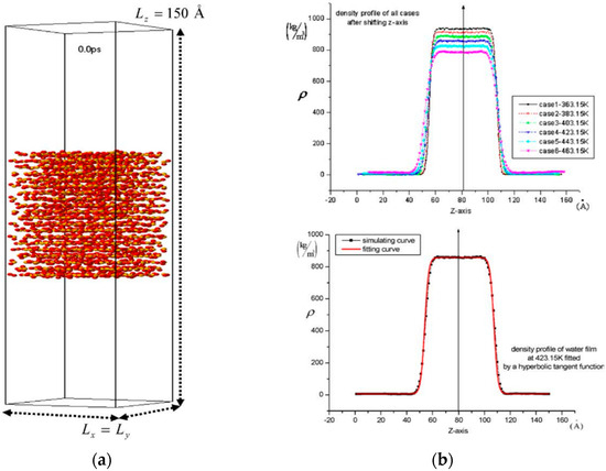 Evaporation is one of the most important interfacial phenomena and has huge applications in engines, thermal management, and micro-cooling technology [61]. The initial studies of evaporation were conducted by Long et al. [62] for liquid argon droplets in subcritical and supercritical surroundings. The outcomes were in good agreement with experimental studies. Subcritical evaporation of a nanodroplet was later conducted by Walther et al. [63] The simulation was conducted at 300 K and 3 MPa using an adaptive tree data structure and neighbor lists for a larger number of molecules. The evaporation coefficient data were in impressive agreement with theoretical predictions. Yang et al. [64] performed MD simulations with the TIP4P water model and vapor as presented in Figure 5a.