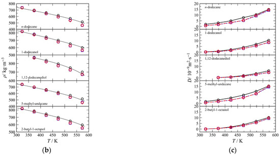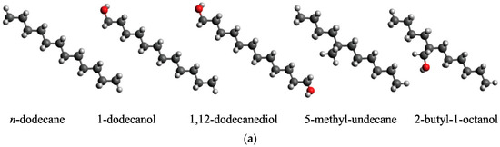 Yang et al. [68] recently investigated the liquid–vapor interfacial behavior for straight and branched-chain alkanes and alcohols using MDs. The structures of the chosen molecules are depicted in Figure 6a. OPLS-AA, TraPPE-UA, and L-OPLS models were considered. The force field data were calibrated to experimental data for the molecules used under the 323.15 K to 573.15 K temperature range. For lower temperatures, all the force fields produced comparable self-diffusion coefficients, liquid densities, and surface tensions. However, the TraPPE-UA force field was able to accurately predict the solvation structures and reproduce the most promising results, considering the overall range of temperatures. Liquid density profiles under different temperature conditions were produced as presented in Figure 6b. The results concluded that elongation of the molecules occurs due to strong polar interactions, and hence, they have higher energy to remain in the liquid phase.