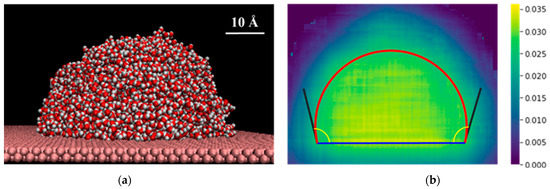Figure 7a,b depicts the water droplet on a Cu (1 0 0) surface [73] and the density plot to calculate the water droplet interface, which is further analyzed to calculate the contact angle and contact diameter using traditional curve-fitting methodologies. The droplet tends to modify its shape until it reaches an equilibrium shape. Previously, the concept of a “mono-layer liquid Film” was very popular, but several theories on the three-phase contact-line were developed based on the movement of the wetting line. The detailed theories connecting the microscopic and macroscopic explanation of the wetting phenomenon were explained by Dussan [74], Banavar, and Koplik [75]. In the most recent theories, it is considered that even though multiple resistances are encountered throughout the movement of the wetting line, the contact line frictional force (CLF) is the dominating one [76]. According to Blake [77], statistical analysis of molecules present in the three-phase zone (TPZ) could be used to identify the displacement of the contact line. The three-phase contact line (TPCL) friction force is the force acting in the TPZ. The TPCL friction force is molecular in nature, and MD research is considered an obvious choice for understanding the impacts of crystal planes on analogous wetting parameters at an atomic level. Molecular Kinetic Theory [78,79] (MKT) is a model that is commonly used in conjunction with AMD simulations for the improved understanding of water-spreading dynamics on hydrophobic surfaces [77], droplet motion on gradient surfaces [80], contact line movement in electrowetting [81,82], different crystal planes [73], and various other similar studies.