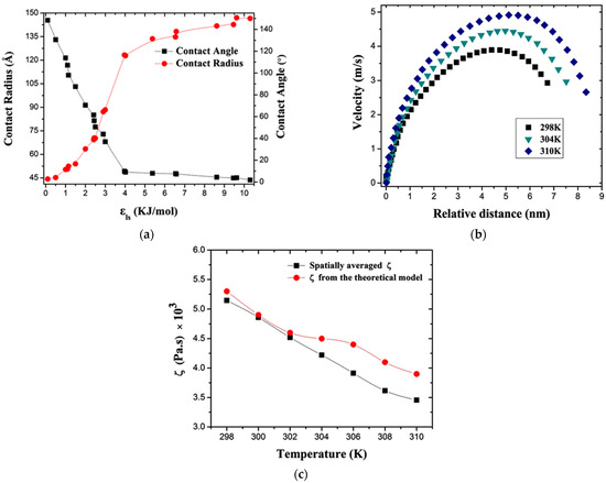 In all the above-mentioned applications, the interaction parameter plays the most important role. A detailed analysis of the wetting properties, such as the contact angle and contact radius, was conducted by Chakraborty et al. [80], where the SPC water model was used. Figure 8a shows that the contact angle rapidly decreases and the contact radius increases with increasing interaction parameters between the solid and the water molecules. Figure 8b indicates that the velocity of the droplet for a particular interaction parameter is temperature-dependent. It shows a steady increase and then a sharp decrease after reaching the maxima, which is in perfect sync with reported experimental observations [76]. The variation in velocity directly affects the contact angle and contact diameter, which, on the other hand, indicates the variation in contact line frictional forces. A detailed MKT analysis was performed to understand the variation in the contact line friction coefficient with temperature. Figure 8c indicates the highly correlated theoretical and MD predictions. However, it is to be noted that the contact line friction force coefficient cannot be directly correlated with experimental observations as the length scale of an actual droplet and droplet used in MD simulations differ by multiple orders of magnitude.